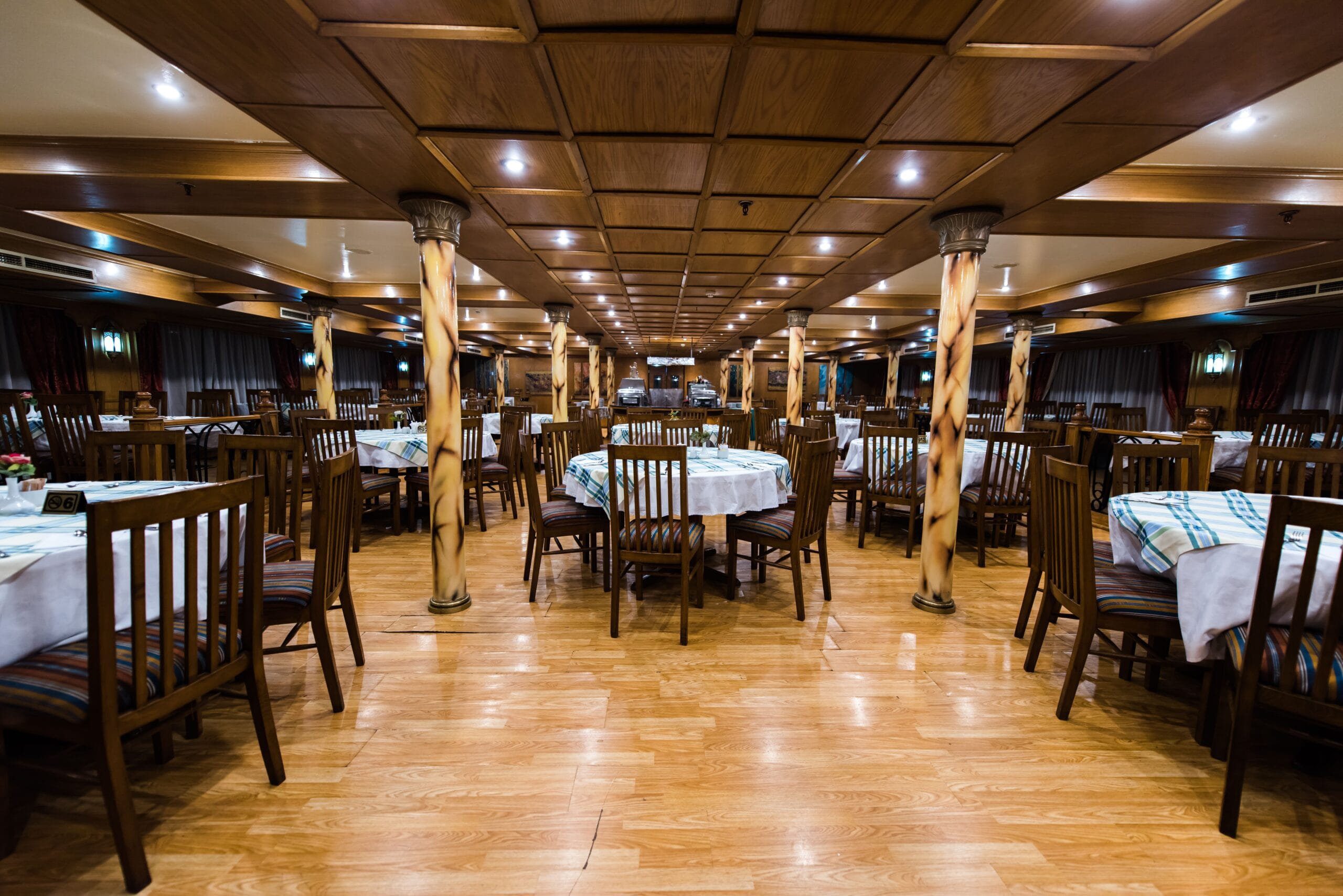 تشمل مرافق المركب مطعمًا رئيسيًا يقدم الوجبات بنظام البوفيه، وبارًا وصالة للاسترخاء في المساء، بالإضافة إلى سطح شمسي واسع مزوّد بمناطق جلوس وحمام سباحة، مما يتيح للضيوف الاستمتاع بإطلالات متواصلة على نهر النيل أثناء الإبحار. وقد صُممت المساحات العامة بما يركز على الراحة والعملية، لتوفير أجواء هادئة ومريحة تهتم بالاستمتاع بالمشاهد الطبيعية وأوقات الترفيه، دون مبالغة في الفخامة.