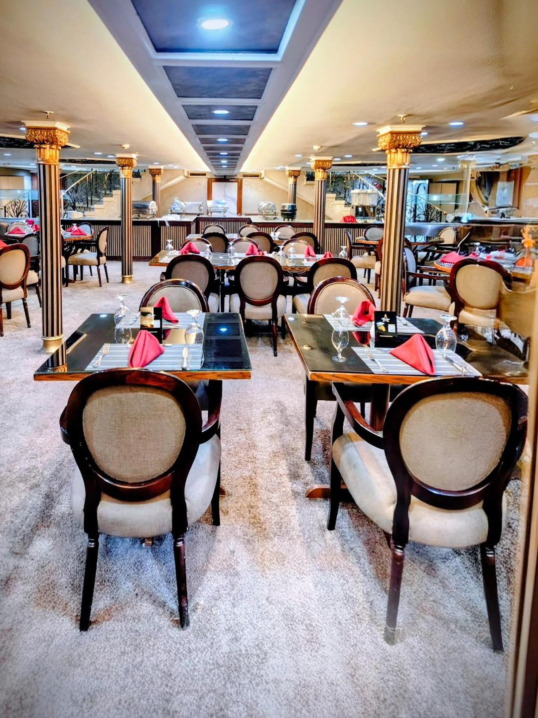 Unforgettable Royal Adventure Nile Cruise: Luxor-Aswan provides a flexible sailing experience, operating departures from Luxor to Aswan and the reverse route from Aswan to Luxor. The Royal Adventure is a well-regarded 5-star Deluxe ship featuring cabins equipped with large panoramic windows, private bathrooms, and air conditioning to ensure comfort throughout the journey. Onboard facilities include a swimming pool on the spacious sundeck, a lounge bar for evening relaxation, and a restaurant offering diverse culinary options while cruising the Nile River.